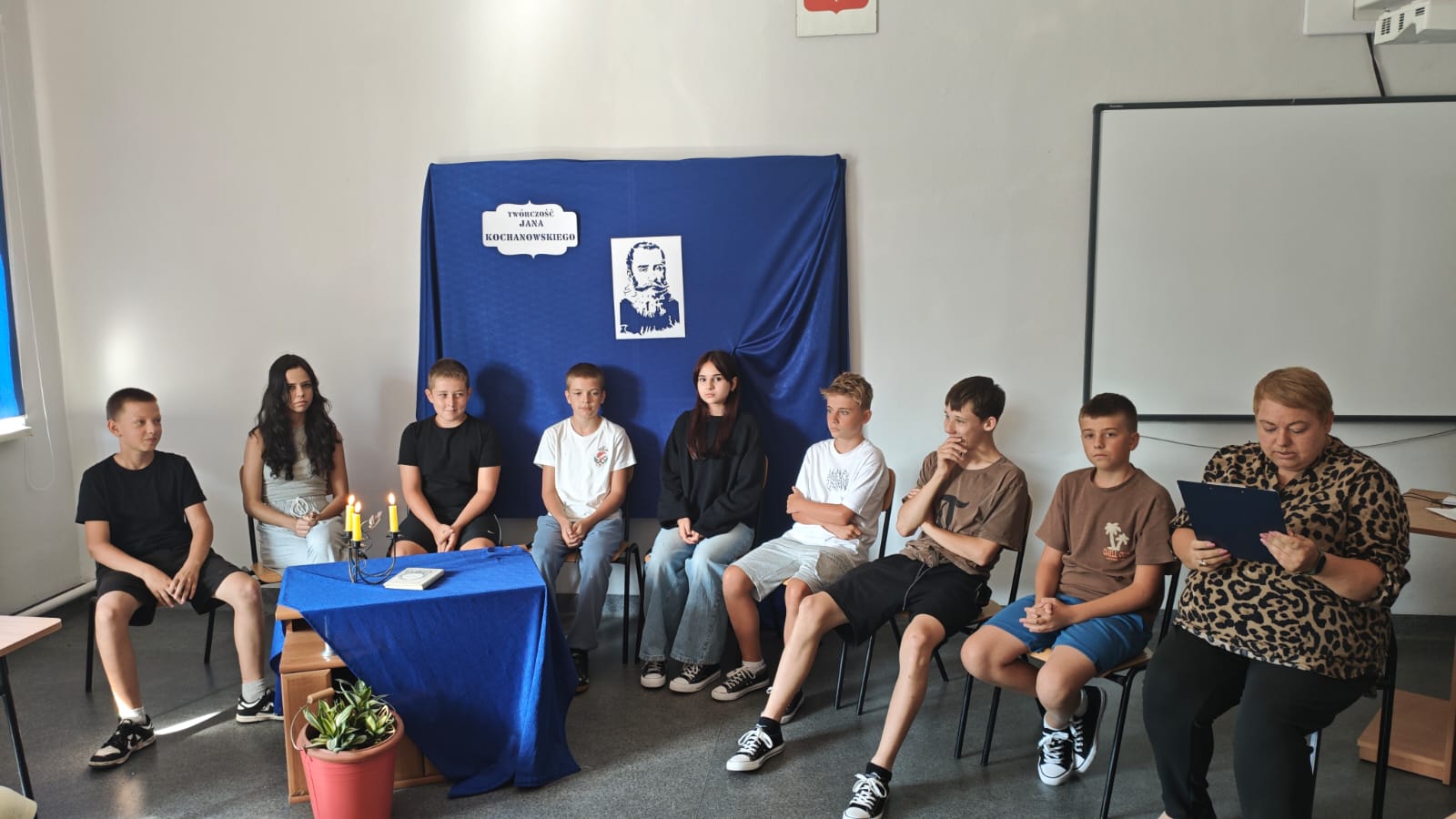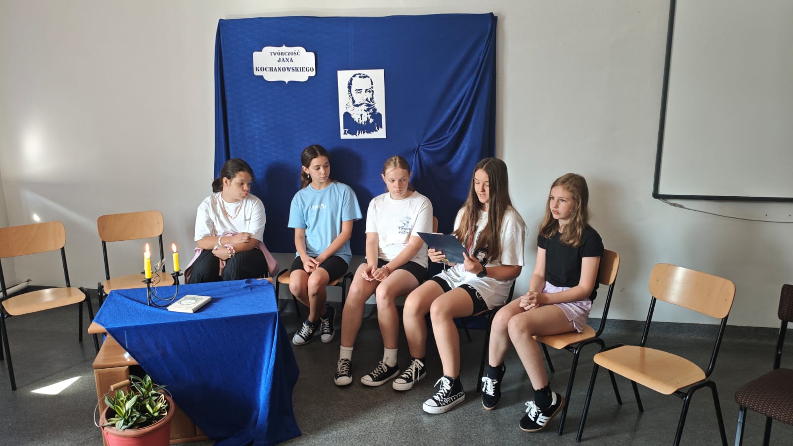 Narodowe czytanie wybranych utworów Jana Kochanowskiego odbyło się w naszej szkole w sali polonistycznej. Wzięli w nim udział nauczyciele i uczniowie. Program rozpoczął się krótkim wstępem dotyczącym wydarzenia a także informacji na temat poety. W odpowiedniej scenografii, przy świecach czytaliśmy fraszki, treny i pieśni Jana Kochanowskiego.